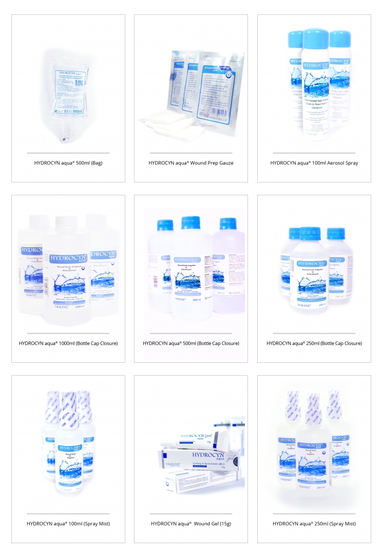 HYDROCYN aqua® is indicated as a wound wash, debridement agent & cleaning solution for acute & chronic wounds such as stage I-IV ulcers, venous stasis & diabetic ulcerations, post-surgery wounds, burns (1st~2nd degree) and bed sores. It is also can be used in moistening, wound dressing during cleaning and irrigating wounds. Visit us at Hydrocyn Aqua website for more details.